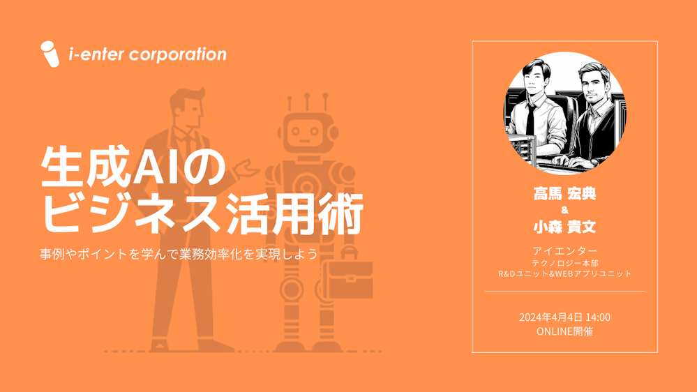 内容 | ■生成AIの基礎知識 - 主な生成AIの種類と特徴 ■アイエンターのビジネス活用事例 - 「自動電話受付&音声文字起こし」による生産性の向上 - 「議事録自動作成」による工数の大幅削減 - 「非定形帳票の読み取り」による作業効率化 - 「チャットボットQA」による社内対応の負荷軽減 ■ビジネス活用におけるポイントと注意点 - 安全に活用するためのポイントや注意点の解説 ■生成AI導入手法と成功の秘訣 - 導入ステップと担当者のマインドセット - 生成AI導入支援サービスのご案内 ■質疑応答 (登壇者:株式会社アイエンター テクノロジー本部 R&Dユニット テクニカルリーダー 高馬 宏典/Webアプリユニット 小森 貴文) |