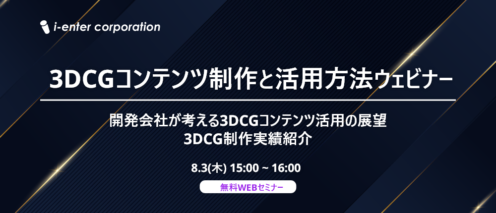 内容 | ■ウェビナーご案内・アイエンター企業紹介 (株式会社アイエンター ソリューション事業本部 会田) ■開発会社が考える3DCGコンテンツ活用の展望 (株式会社アイエンター ソリューション事業本部 会田) ■3DCG制作実績紹介 (株式会社アイエンター テクノロジー本部 梶岡 ※事前録画) ■質疑応答 |