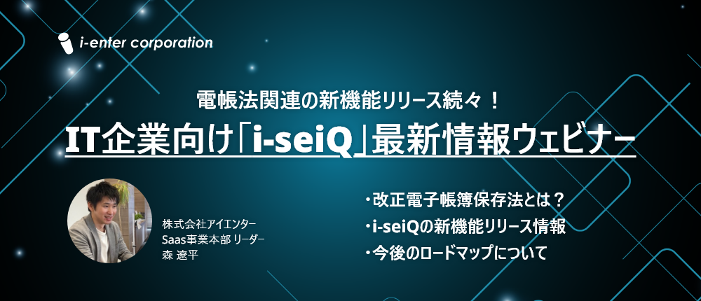 内容 | ■ 改正電子帳簿保存法とは? ■ i-seiQの新機能リリース情報 ■ 今後のロードマップについて (登壇者:株式会社アイエンター SaaS事業本部 リーダー 森 遼平) |