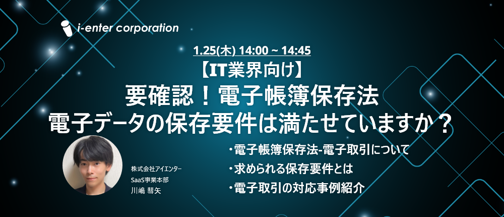 内容 | ■電子帳簿保存法-電子取引について ■求められる保存要件とは ■電子取引の対応事例紹介 (登壇者:株式会社アイエンター SaaS事業本部 川嶋彗矢) |